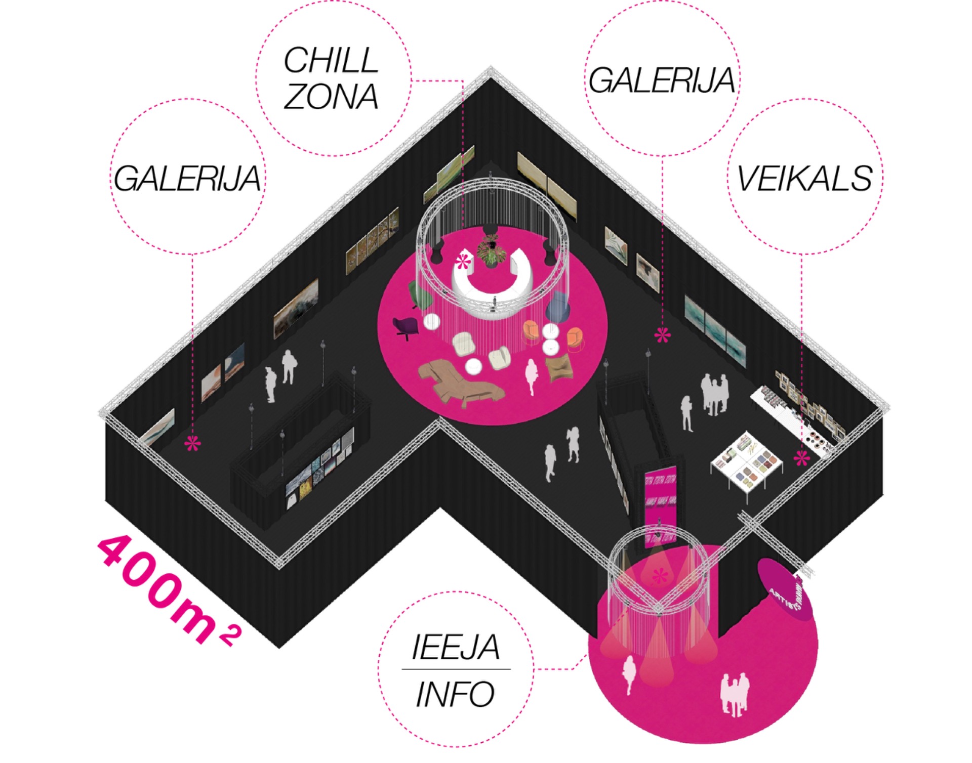 Šī gada koncepciju veidoja vairākas savstarpēji saistītas zonas – ieejas daļa ar informāciju par izstādi un māksliniekiem, galerijas ekspozīcijas ar dažādu stilu un mērogu gleznām, atpūtas zona ar dizaina mēbelēm, kā arī mākslas veikals ar iespēju iegādāties dizaina priekšmetus un gleznu reprodukcijas. Visa telpa tika būvēta kā vizuāli noslēgta, bet saturiski atvērta vide – ar skaidru ieeju un virzību, kas simboliski ved skatītāju cauri nesteidzīgai mākslas pieredzei.