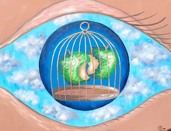 "Brīvība gūstā" 60x80 cm, 2024 - Acs kļūst par logu uz iekšējo pasauli, kur sapņi un noslēpumi ir ieslodzīti būrī. Darbs aicina pārdomāt redzējuma, brīvības un apziņas robežas.