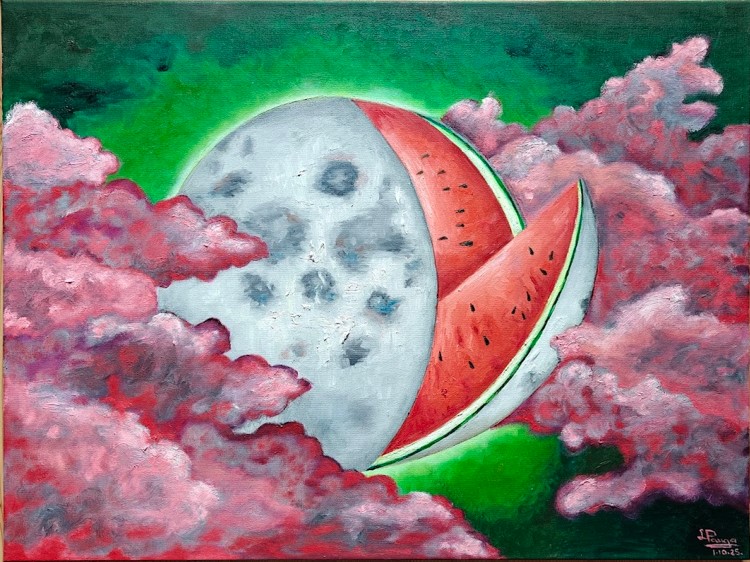 "Bezgalības garša" 60x80 cm, 2025 - Šis darbs ir sirreāls debesu un zemes formu saplūdums, kas aicina skatītāju apšaubīt realitāti un atklāt negaidīto pazīstamajā. Mēness, pārveidots par arbūzu, simbolizē slēptu barību kosmosā un uztveres rotaļīgo absurditāti.