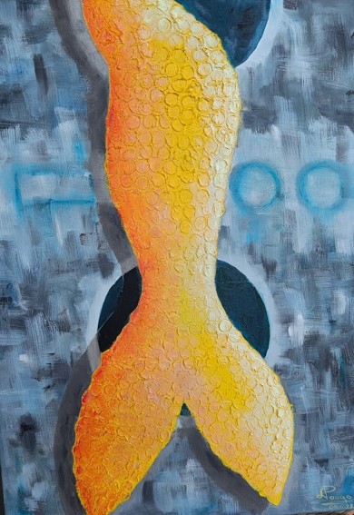 "Nezināmā aste" 50x70 cm, 2022 - Zelta aste iznirst no abstraktiem ūdeņiem, norādot uz radību, kas palikusi ārpus redzesloka. Darbs aicina skatītāju izzināt noslēpumu, atmiņu un neredzamos dziļumus.